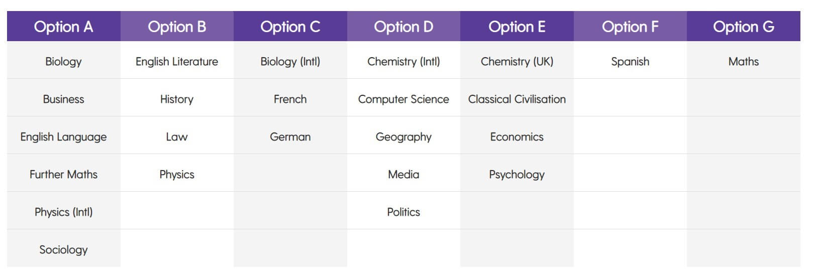 - 4 предмета на выбор: Биология, Бизнес, Химия, Экономика, Компьютерная наука, Классическая цивилизация, Английский язык, Английская литература, Французский язык, Продвинутая Математика, География, Немецкий язык, История, Право, Математика, Медиа, Физика, Политика, Психология, Социология, Испнаский язык
